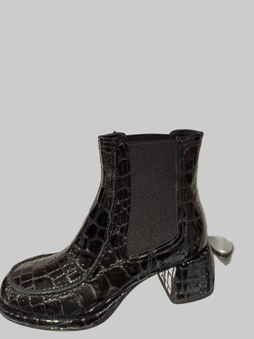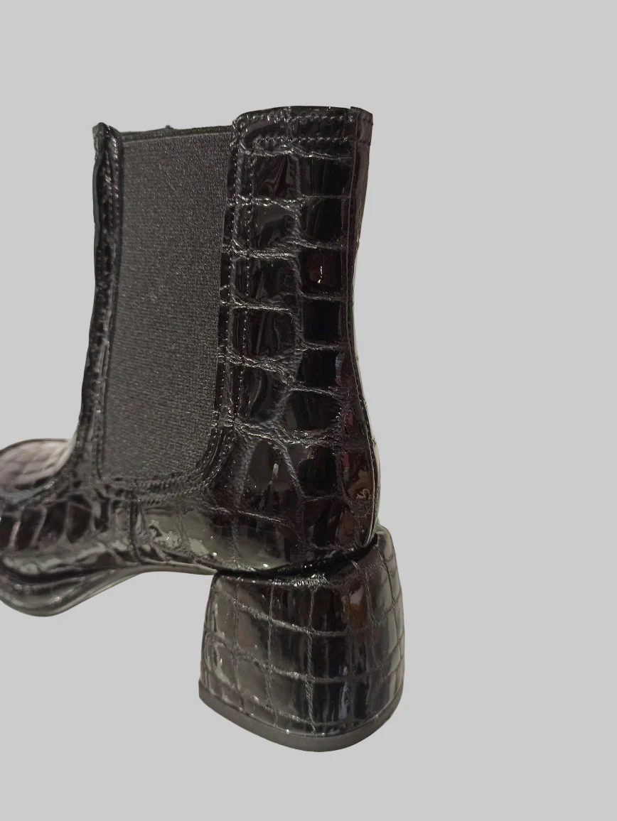 Alliant élégance et caractère, ces Chelsea boots en cuir vernis noir embossé offrent un style unique et contemporain. Leur talon carré de 4 cm assure une démarche confortable et raffinée, tandis que la semelle en cuir garantit durabilité et qualité. Idéales pour sublimer vos looks avec une touche sophistiquée, ces boots sont un incontournable pour celles qui recherchent à la fois style et confort.
