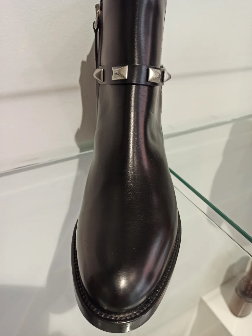 Bottes Sartore en cuir lisse noir, sublimées par une bride ornée de clous argentés. Un design intemporel qui allie élégance classique et détails rock chic. Le cuir premium garantit confort et durabilité, tandis que les clous apportent une touche de caractère affirmé. Parfaites pour structurer vos tenues, du jour au soir. Une paire d’exception qui devient rapidement indispensable.